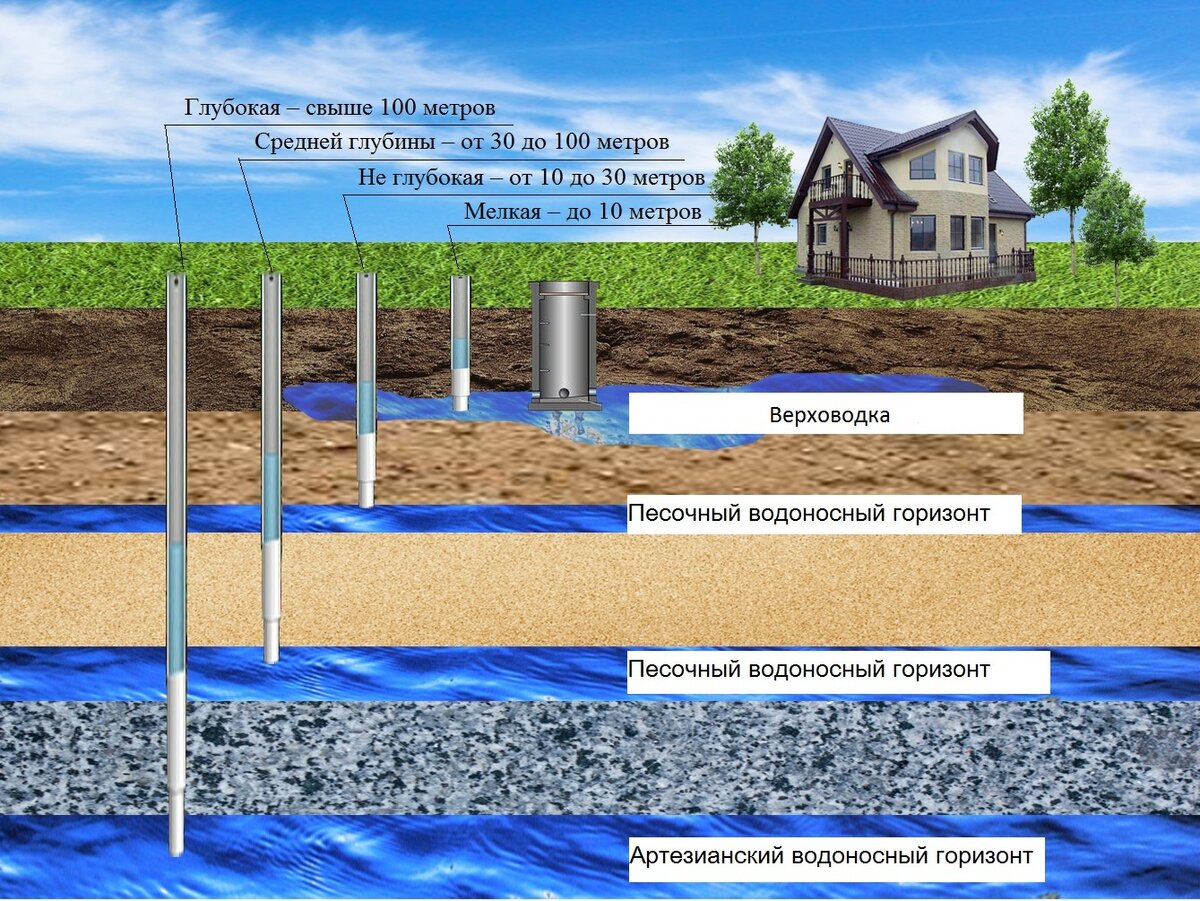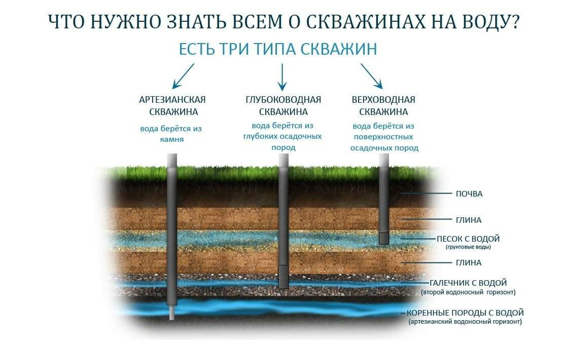 En fonction des caractéristiques de la géologie de la région, de la densité de population, de l'éloignement de la civilisation et d'autres facteurs, il existe plusieurs moyens principaux d'obtenir de l'eau des entrailles de la terre :