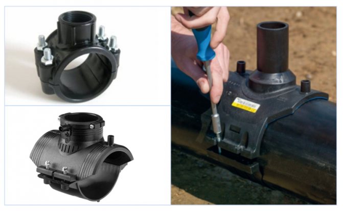 Si le tuyau est en polyéthylène ou en un autre type de plastique, aucune soudure n'est nécessaire. Dans ce cas, des dispositifs spéciaux sont utilisés - des selles pour puiser dans l'alimentation en eau. Ce raccord est un té dont les buses sont démontées en deux moitiés.