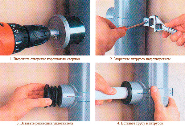 Après avoir installé la selle, un trou est fait dans le tuyau en plastique. Les travaux ultérieurs ont le même aspect que lorsque vous travaillez avec un pipeline en acier.