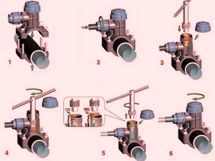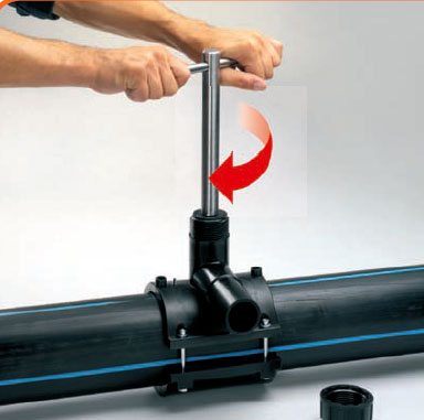 Cette méthode vous permet également de vous connecter à un tuyau en plastique sous pression avec de l'eau. Pour cela, une vanne intégrée est installée dans l'ensemble, en tournant un trou est percé. Après avoir obtenu le résultat souhaité, la vanne se ferme et la fraise remonte.