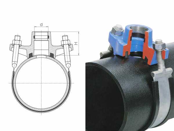 Pince à mortaise C'est une pièce ordinaire, composée de deux moitiés de formes semi-circulaires. Ces moitiés sont placées sur le tuyau et assemblées avec des boulons et des écrous. Ils ne diffèrent des pinces ordinaires que par la présence d'un trou fileté sur l'une des parties métalliques. Un raccord est inséré dans ce trou, qui fait partie de la ligne de dérivation.Vous pouvez positionner le trou pour le tuyau n'importe où dans l'alimentation en eau, et lors du vissage du raccord, il sera toujours perpendiculaire au plan linéaire de la surface du pipeline.