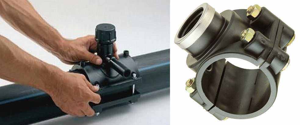 Le piquage dans des tuyaux en plastique ou en polyéthylène se fait à l'aide de colliers ou de selles en plastique (demi-collier avec attaches). Les pinces et les selles sont simples et soudées. Travailler avec des appareils simples n'est pas très différent du raccordement avec une pince dans un tuyau en acier. Et dans les selles ou pinces soudées, il y a tout l'équipement nécessaire au soudage. Un tel ensemble de selle est installé sur le tuyau à l'endroit prévu, les bornes sont connectées à l'électricité et après quelques minutes, le raccordement sera automatiquement effectué.