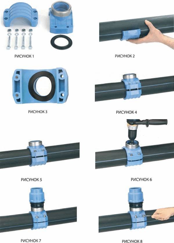 Considérez comment intégrer dans une conduite d'eau en plastique de différentes manières : en sertissant une pince avec un revêtement, en connectant un collecteur ou un té, en installant une selle de soudage électrique, en fournissant un raccordement à travers un tuyau.