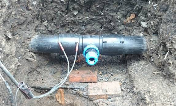 - Une fois tous les travaux de terrassement terminés, un trou est découpé dans le tuyau principal à l'aide d'un autogène et un tuyau de dérivation avec des filetages de tuyau coupés y est soudé.