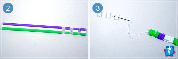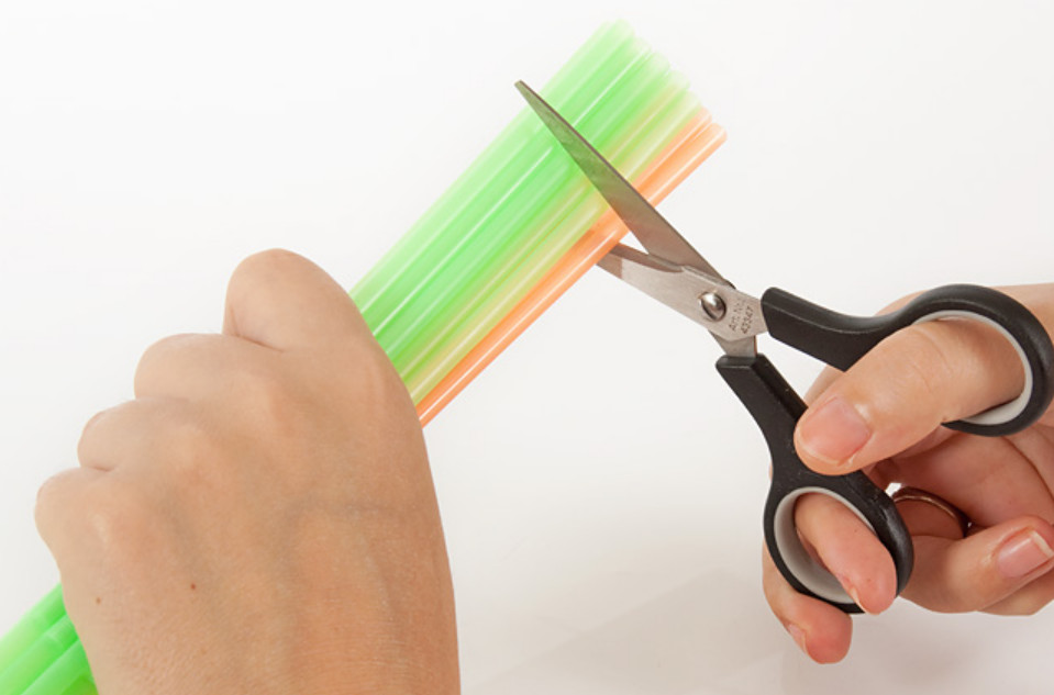 Vous devez préparer un paquet de pailles blanches, des ciseaux, un pistolet à colle, 2 tubes verts.