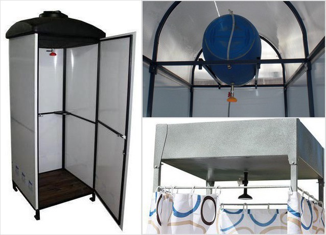 Les conteneurs de douche se sont généralisés. Ils ont un volume de 150 à 200 litres et sont utilisés pour effectuer des procédures d'hygiène dans une maison de campagne.De tels réservoirs prévoient nécessairement la présence d'une vanne de vidange, d'un système de fixation, ainsi que d'un connecteur pour fixer un arrosoir.