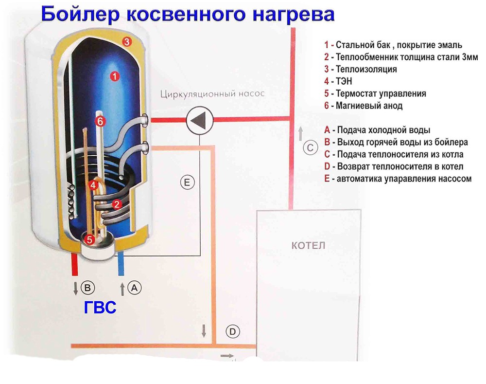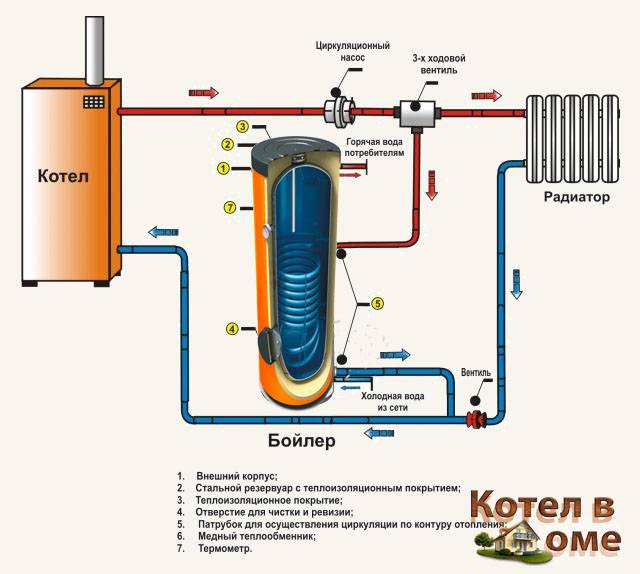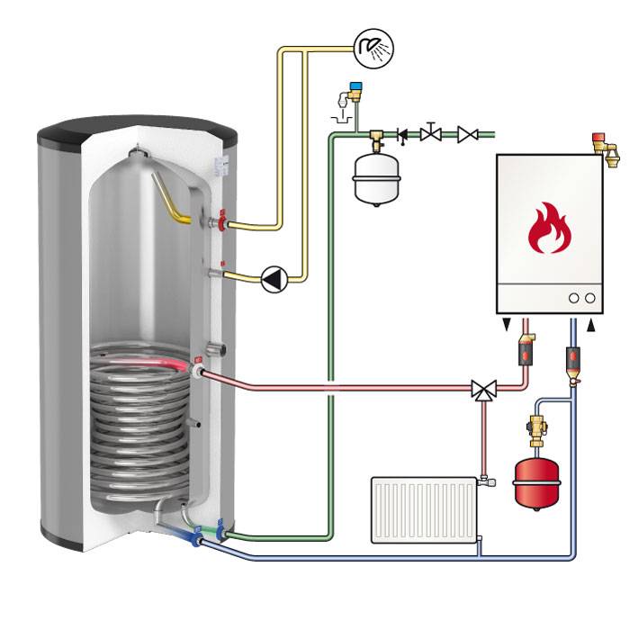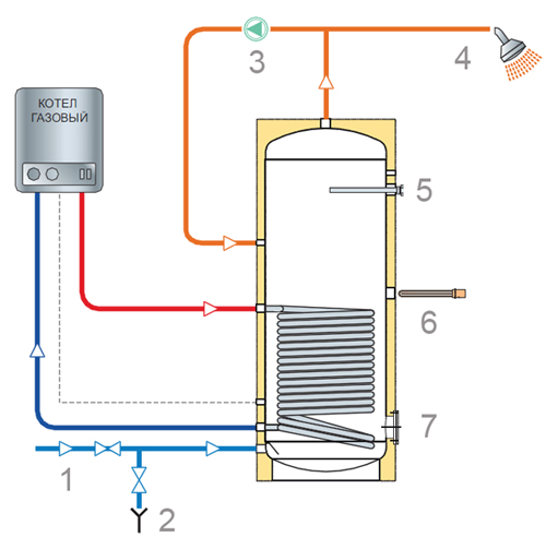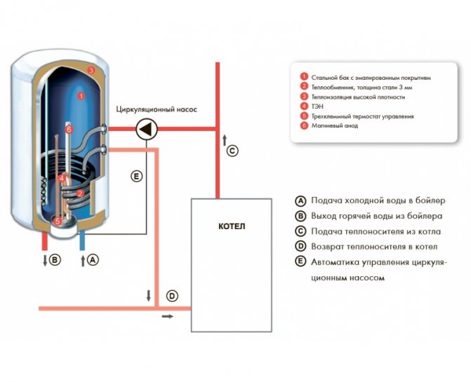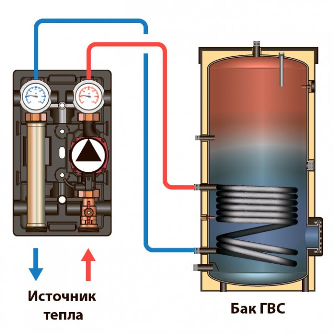 Ce type de chaudière est un réservoir à travers lequel passe le serpentin et possède également un radiateur électrique intégré. L'eau chaude de la chaudière traverse le serpentin et, à l'aide d'un élément chauffant, le liquide est chauffé.