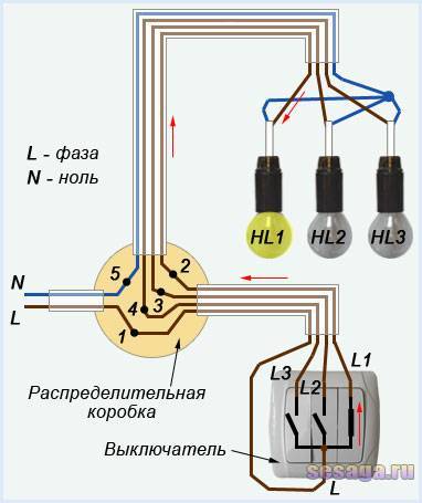 Depuis les trois contacts de sortie supérieurs des fils de phase du commutateur L1, L2, L3 le même câble va à la boîte de jonction, où aux points 2, 3, 4 connecté aux fils du câble allant au plafond. Sur les fils de phase du plafond L1, L2, L3 connecter aux bornes marron des lampes HL1, HL2, HL3.