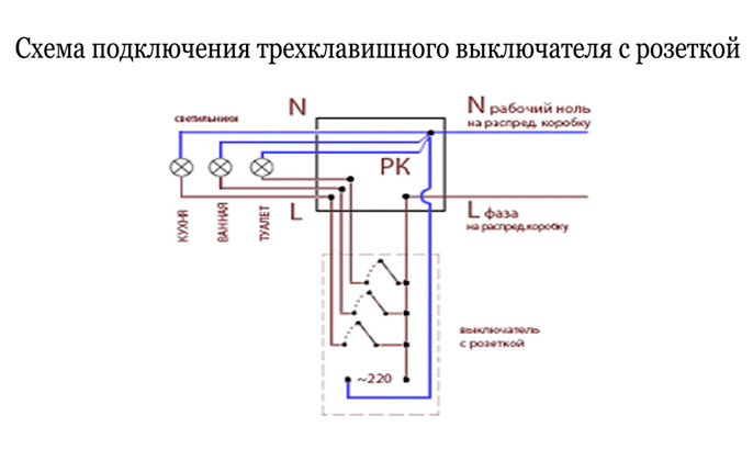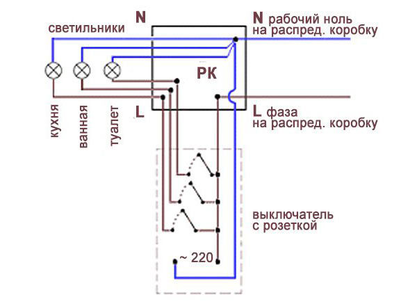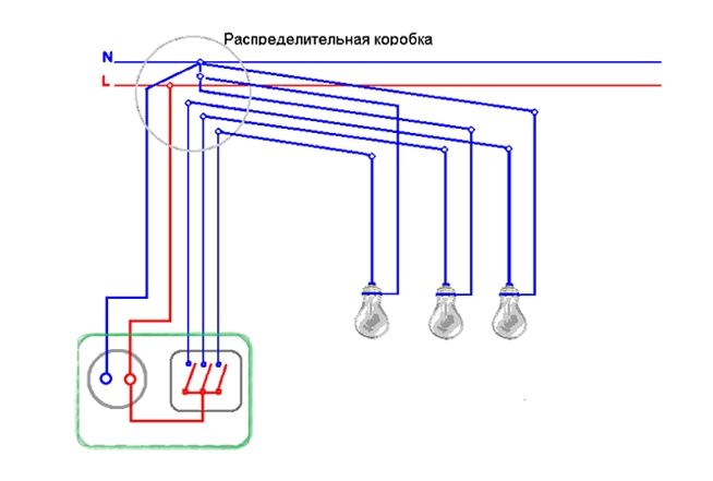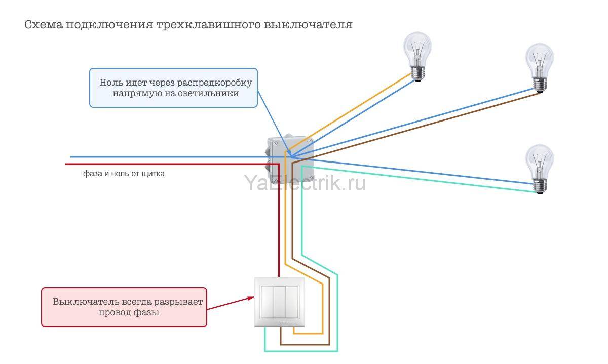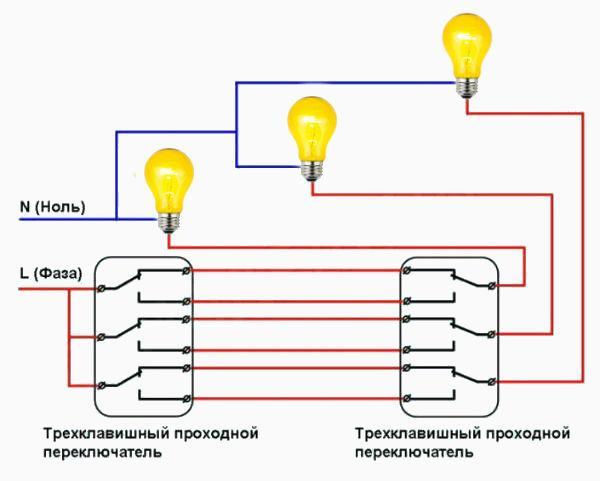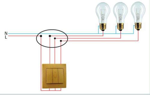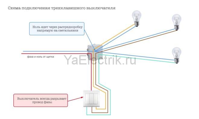 Il ne faut pas oublier que le zéro n'est pas dirigé vers l'interrupteur. Il va directement aux lampes. Par le contact de l'appareil à trois clés, 1 phase est interrompue.