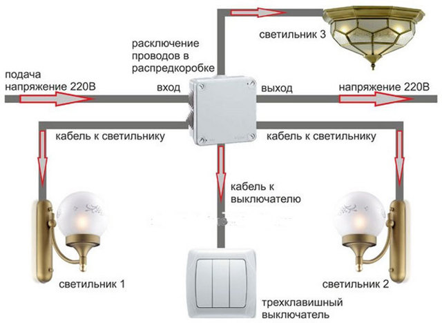 Il vaut mieux ramener le même coup tous les fils triphasés à la boîte de jonction, puis amenez-les aux lampes le long de la porte supérieure commune.Si nous filons au lustre, la dernière option est la meilleure.