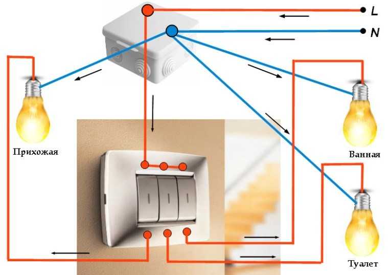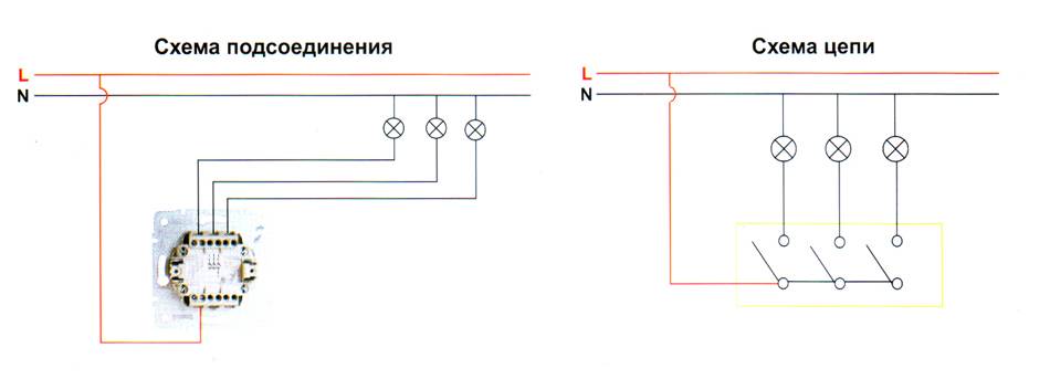 Pour assurer la sécurité et la stabilité de l'installation de l'interrupteur intégré, utilisez un boîtier de montage sous la prise - un boîtier de protection en plastique. Interrupteur lumineux à deux gangs L'interrupteur lumineux ne diffère de l'interrupteur habituel que par le fait qu'il contient un indicateur de rétroéclairage. Raccordement aux contacts en l'absence de ligne de masse Schéma de câblage interrupteurs doubles deux ampoules au système TN-C. La phase d'entrée est envoyée pour couper, puis elle est divisée en trois conducteurs de phase différents, chacun étant envoyé à son propre groupe d'ampoules.À l'état éteint, l'interrupteur est éclairé par une LED et vous n'avez pas besoin de le chercher longtemps dans une pièce sombre.