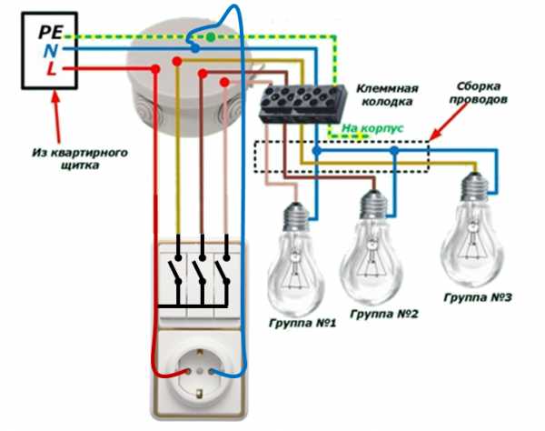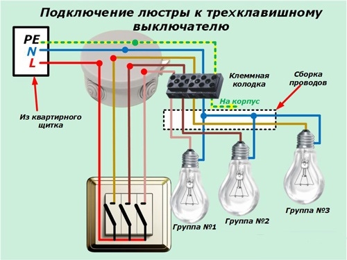 L - phase à l'interrupteur (rouge); puis la phase (jaune, marron, rose) passe à trois groupes de lampes de lustre ; N - zéro de travail (bleu), va directement au lustre et est élevé par le bornier du lustre en groupes; PE - mise à la terre (jaune-vert), connectée au corps du lustre