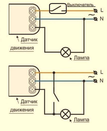 Le premier vous permet de contrôler la lampe uniquement via le capteur, le second ajoute la possibilité d'allumer la lumière avec un interrupteur, qu'il y ait ou non un mouvement dans la zone de visibilité du capteur (le capteur fonctionne dans le "off " Etat).