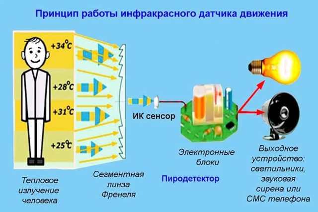 La base du capteur de mouvement est une cellule photoélectrique infrarouge avec un circuit de traitement électronique du signal. Le capteur réagit à tout changement de rayonnement infrarouge dans la zone contrôlée. Étant donné que les personnes et les animaux domestiques ont une température plus élevée que l'environnement, le détecteur note immédiatement leur apparition dans la zone de suivi. Pour empêcher la photocellule de réagir aux objets chauffés stationnaires, plusieurs méthodes technologiques sont utilisées à la fois: