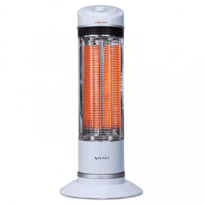 Faites immédiatement une réservation sur le fait que l'appareil ressemble beaucoup à un radiateur infrarouge ordinaire. La différence est que l'élément chauffant ici n'est pas une spirale de tungstène, mais une fibre de carbone spéciale réalisée sous la forme de «boucles» de cordons et de rubans. Cet élément est dans un tube de quartz, à partir duquel l'air est complètement pompé (vide).