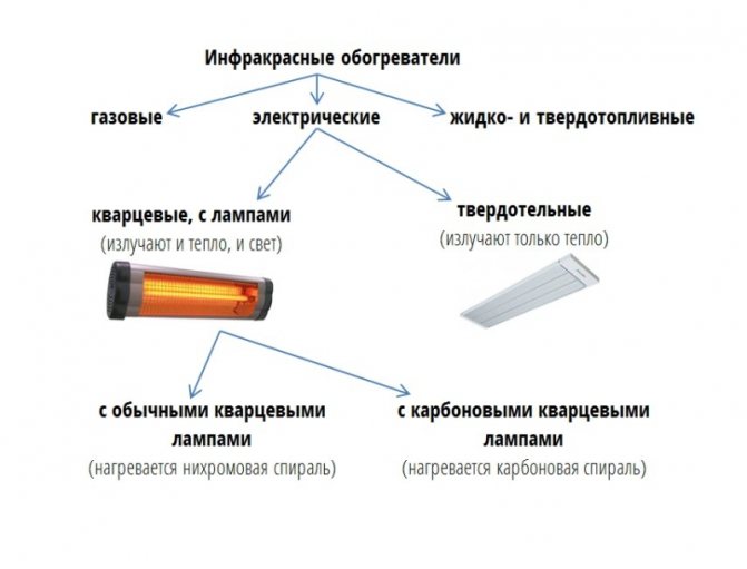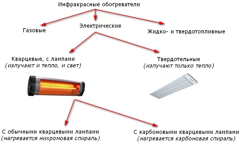 Il existe sur le marché des appareils IR pour une installation extérieure et intérieure. Les fabricants produisent des modèles domestiques et industriels qui diffèrent par leur apparence, leur température de chauffage et leur puissance. Il existe des échantillons pour les pièces à forte humidité (saunas) et avec protection contre les explosions.
