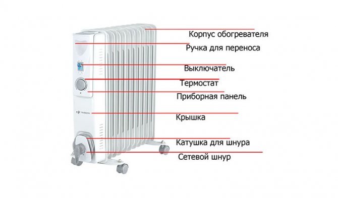 Extérieurement, ce type d'appareil ressemble à une batterie en fonte sectionnelle classique. Cependant, en fait, le corps d'un tel radiateur est en acier plus léger, qui chauffe plusieurs fois plus rapidement. Le plus souvent, les refroidisseurs d'huile ont des roues pour un transport facile. Toutes les coutures sont scellées. À l'intérieur - de l'huile minérale et respectueuse de l'environnement, qui est chauffée presque à ébullition.
