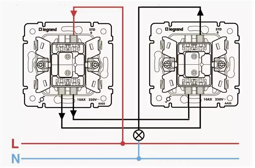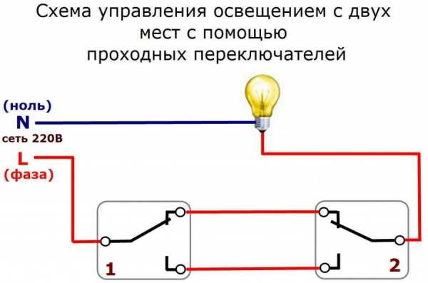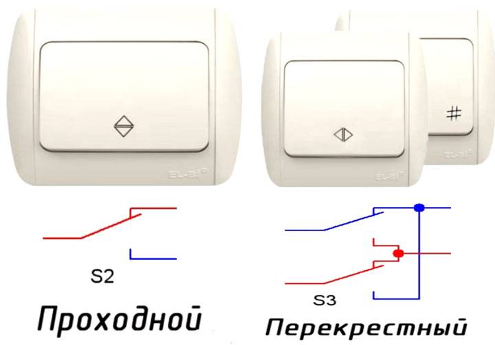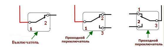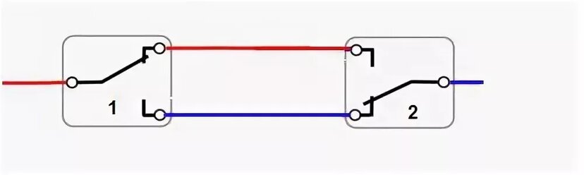 Un interrupteur traversant est un dispositif de contact inverseur. Extérieurement, il ressemble exactement à un normal. Le circuit sur de tels commutateurs est le suivant.