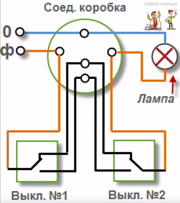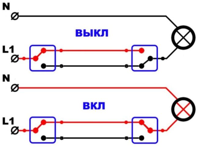 L'inconvénient d'un tel schéma est la position peu claire de l'interrupteur lorsque la lumière est éteinte. La clé de l'interrupteur peut être en position haute ou basse. C'est-à-dire que la position des touches des deux interrupteurs lorsque la lumière est éteinte est en opposition de phase.