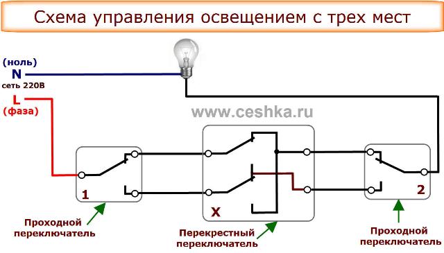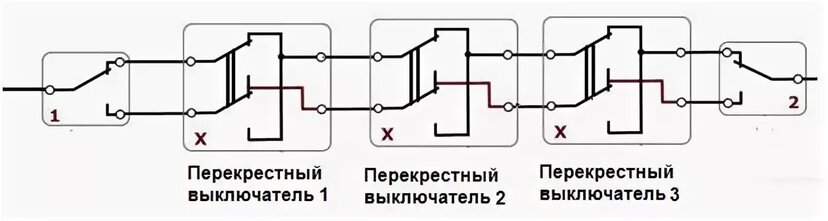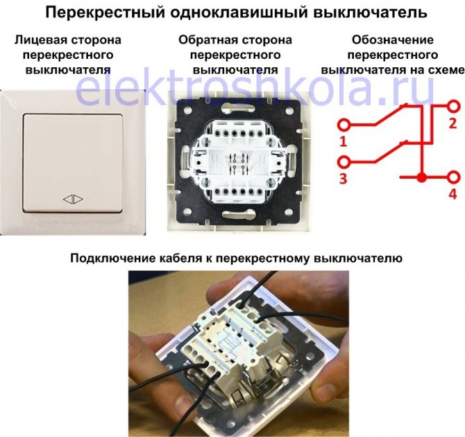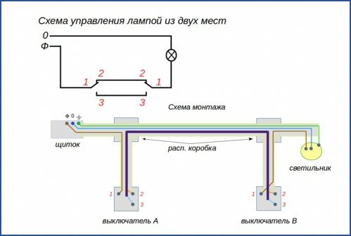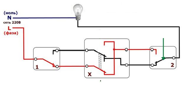 À ces fins, il sera nécessaire d'intégrer un autre élément dans le circuit - un interrupteur croisé, qui est connecté dans une rupture dans un fil à deux fils (c'est-à-dire entre des dispositifs de passage).