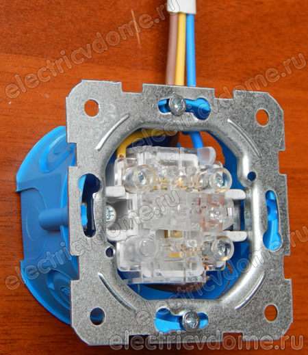 Cette caractéristique de conception du commutateur d'intercommunication est basée sur un schéma de réseau dans lequel un appareil d'éclairage peut être contrôlé à partir de deux endroits différents. Les fils neutre et de terre de la boîte de jonction sont conduits au dispositif d'éclairage et un espace est créé dans le conducteur de phase par deux interrupteurs de traversée, entre lesquels sont posées deux lignes alternatives.