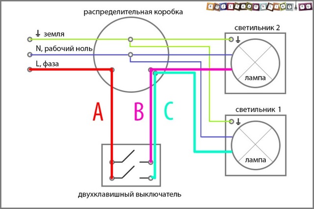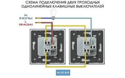 Si à la connexion d'interrupteurs conventionnels utilise deux fils (phase cassable), alors trois conviennent aux passages, dont deux sont des cavaliers entre les interrupteurs de marche, et à travers le troisième, une phase est fournie à un interrupteur, qui du deuxième appareil va à la source lumineuse.