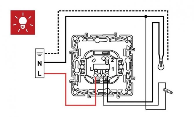 - Les fils sont connectés aux bornes à l'aide des marquages sur le corps du produit. Dans ce cas, le fil entrant est indiqué par la lettre L (L1 et L2 si l'interrupteur est à deux touches), et les fils sortants sont indiqués par des flèches. Parfois, un schéma de câblage est appliqué à l'arrière du boîtier. L'ordre dans lequel les fils sont connectés n'a pas vraiment d'importance, cela peut être fait dans n'importe quel ordre.