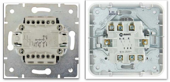 La conception de l'interrupteur prévoit la présence de quatre contacts, dont deux sont connectés aux bornes d'un interrupteur et deux autres au deuxième appareil.