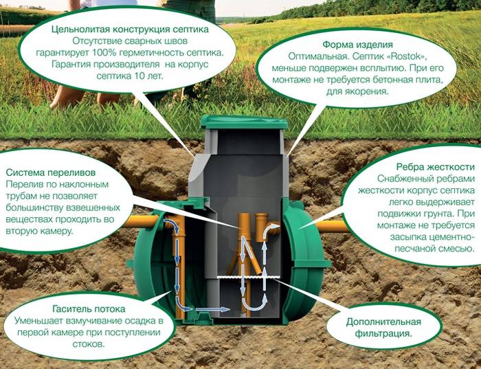 - "Rostok mini" - un récipient cylindrique, divisé en 2 chambres. La structure du réservoir est coulée, sans coutures, avec des raidisseurs pour renforcer la structure. La qualité de purification de 80% est obtenue par un biofiltre installé dans le système.