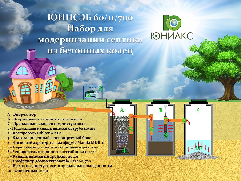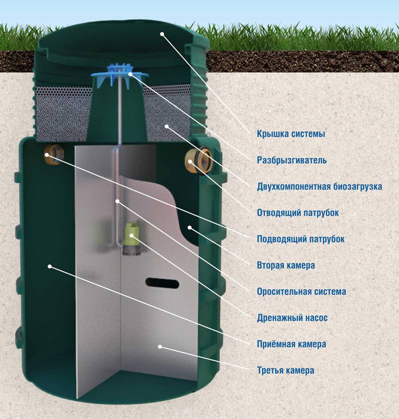 L'évaluation des fosses septiques pour les chalets d'été est poursuivie par le système Tver. Sa particularité est sa disposition horizontale, grâce à laquelle toutes les zones de nettoyage sont situées les unes après les autres. Les zones de nettoyage du dispositif comprennent une fosse septique, un bioréacteur, un bassin d'aération, une chambre secondaire, un aérateur et un décanteur tertiaire.