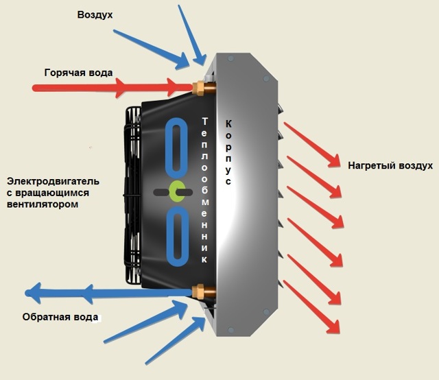 Lorsqu'il est soufflé avec de l'air, il se réchauffe et pénètre dans le volume de la pièce. Le principe général de fonctionnement est similaire à la mécanique d'un refroidisseur d'huile :