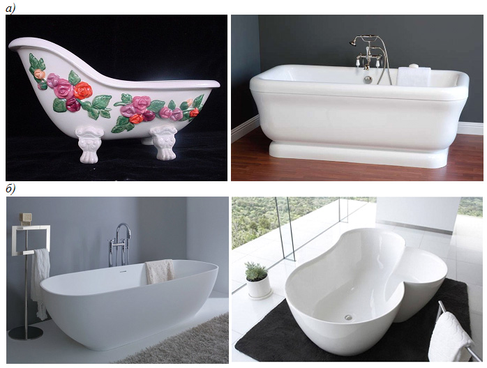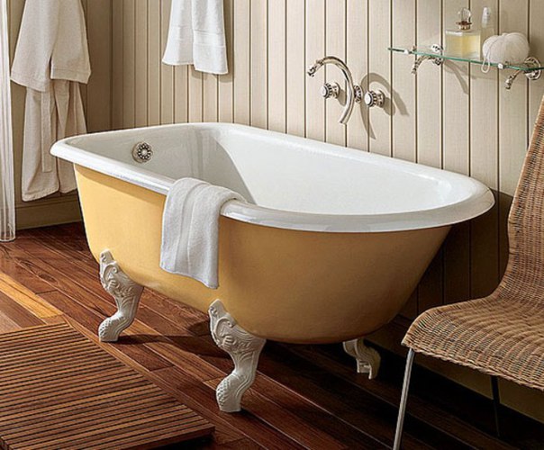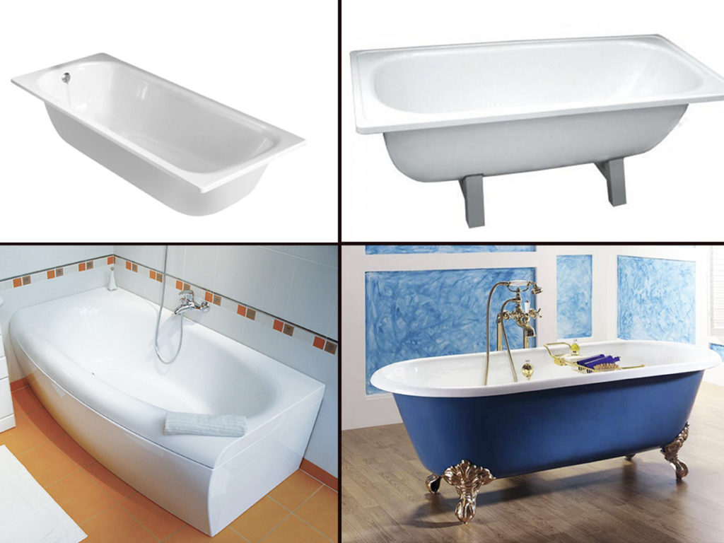 La couleur blanche des baignoires est donnée par le revêtement en émail, assez difficile à entretenir pour le conserver dans sa forme d'origine. Dans les modèles modernes, au lieu d'un revêtement en émail, un revêtement en polymère est utilisé, ce qui nécessite moins d'entretien. Les modèles en fonte en forme de récipient ne sont que ovales et rectangulaires. Ces produits offrent les avantages suivants :