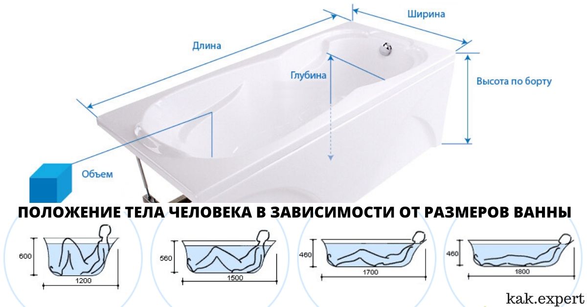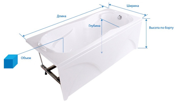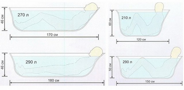 Pour que l'adoption de procédures d'eau et / ou d'hygiène dans le bain soit aussi confortable que possible, elle doit avoir des dimensions suffisantes pour cela, dont les principales sont la longueur et la profondeur (la largeur standard minimale de 70-80 cm est optimale pour les personnes de corpulence standard). Afin de rendre le bain plus profond, mais pas plus volumineux, les fabricants utilisent, par exemple, la méthode consistant à disposer des côtés plus inclinés.