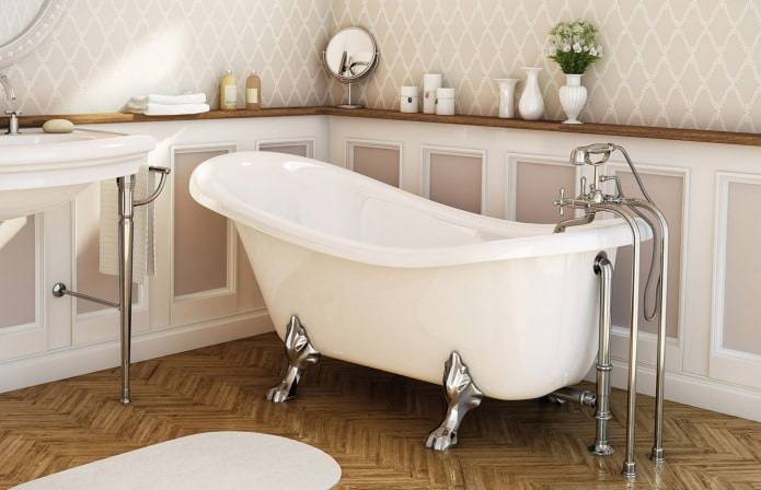 - Rectangulaire. La version classique de la salle de bain, connue de nous depuis l'époque soviétique. Ces modèles universels conviennent à toutes les pièces. Ils sont faits de divers matériaux, généralement montés au mur, mais des options d'installation au centre sont possibles. Parfois, ils sont vendus avec des panneaux décoratifs qui couvrent les communications.