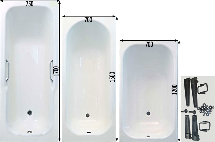 Les baignoires de cette forme sont fabriquées à partir de tous les matériaux possibles. En plus des baignoires de tailles standard 180×80 cm, il existe sur le marché des modèles aux dimensions allant de 120×70/75/80 cm, les dites « assises », à la pleine grandeur 120/150/160/170 /180×70-75/80.