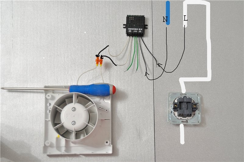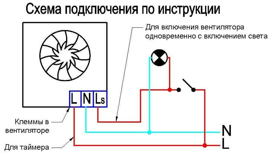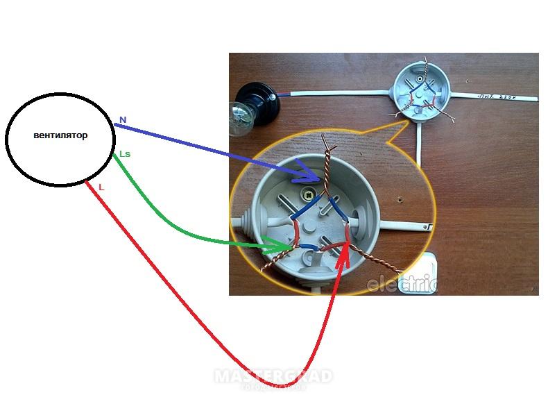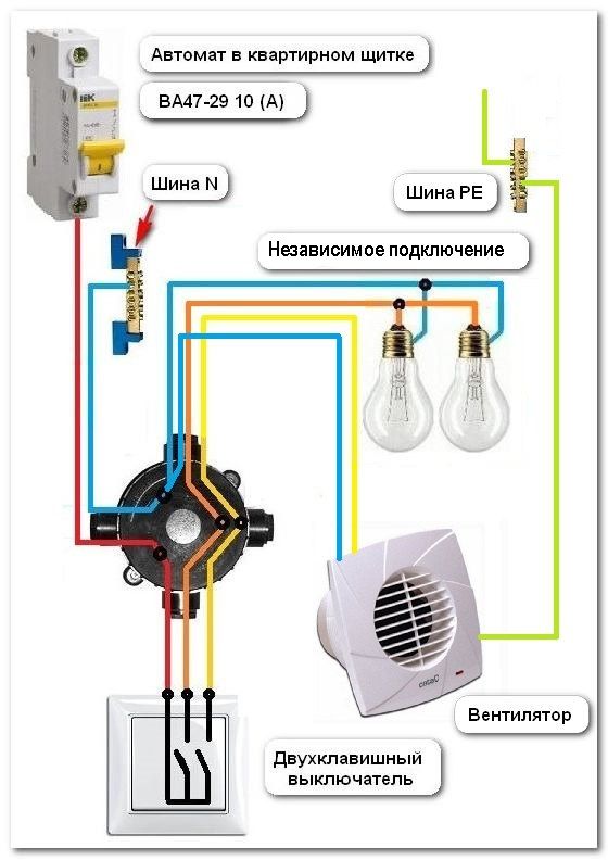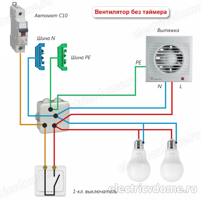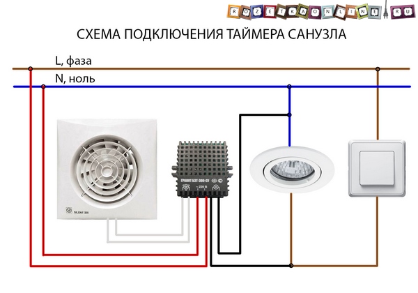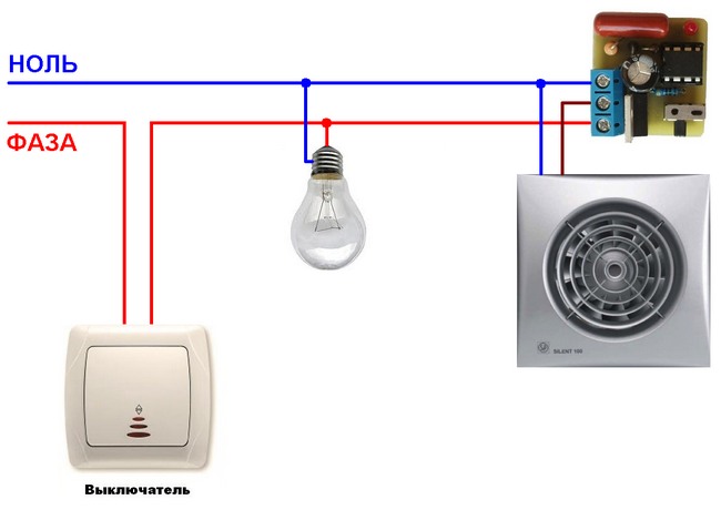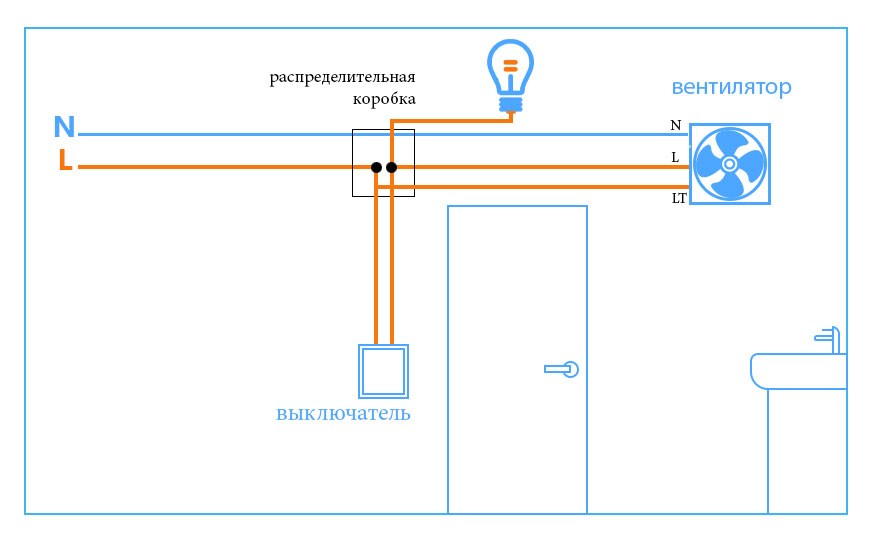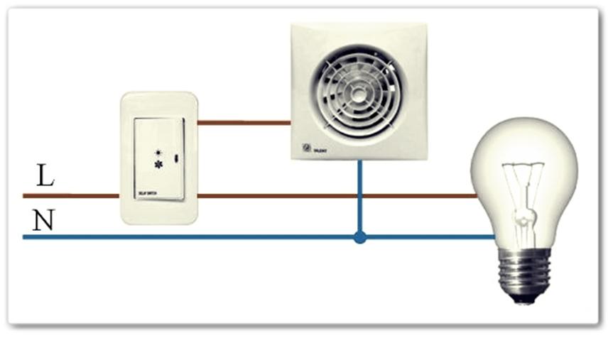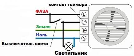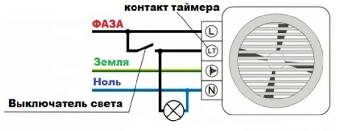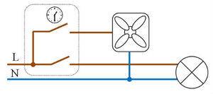 2. Démarrage par interrupteur séparé ou en parallèle avec l'éclairage. Le ventilateur lui-même n'a également que 2 fils, mais les schémas de connexion possibles sont plus compliqués et variés. Y compris avec une minuterie ou un hygromètre externe, un détecteur de mouvement ou une ouverture de porte.