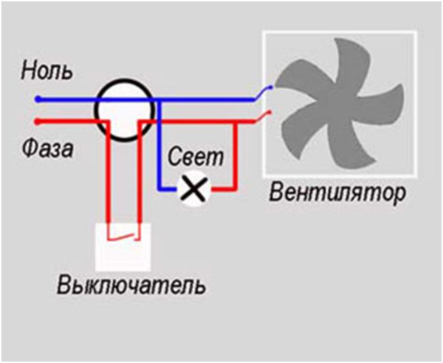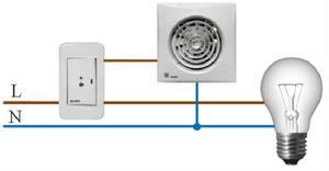 1. Le schéma le plus simple consiste à le connecter en parallèle avec l'un des luminaires. Dans ce cas, la hotte commencera à fonctionner en même temps que l'éclairage sera allumé.