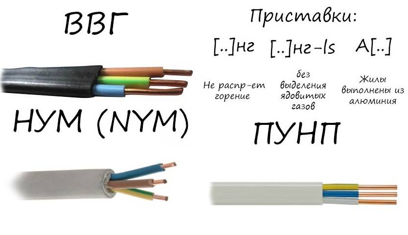 Dans la première colonne, où «Câble sans désignations» est indiqué, nous entendons le VVG habituel. Il ne peut être utilisé que dans des locaux industriels et des structures de câbles.