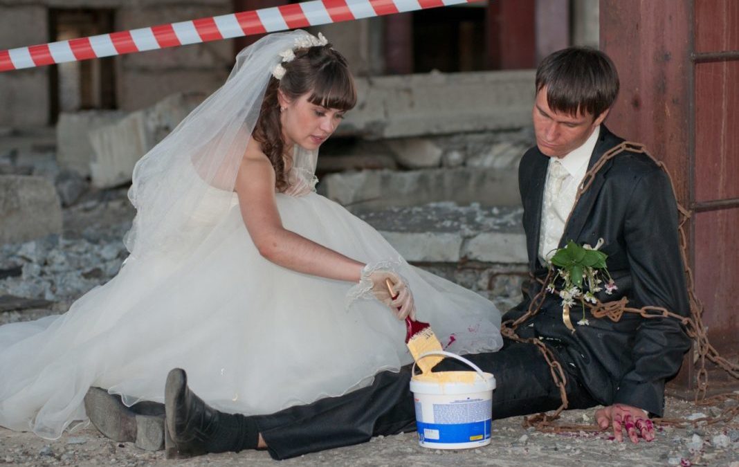 - Avant d'entrer dans la salle, les jeunes mariés se traitent avec du pain salé. Ce devrait être la dernière fois qu'ils s'embêtent.