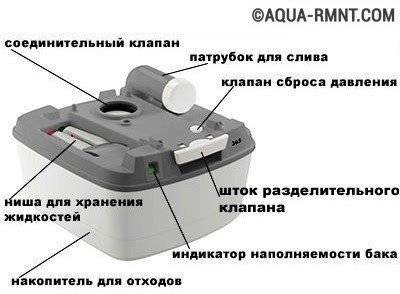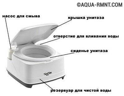 L'appareil se compose de deux parties - le bol supérieur avec un siège et l'entraînement inférieur. Après avoir rempli le récipient, il est vidé dans les égouts, le tas de compost ou le puisard. Avec un traitement biologiquement sûr, il est permis d'utiliser un substitut pour fertiliser le sol du jardin.