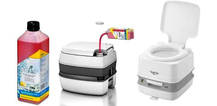 Chimique les modèles sont les plus légers et les plus compacts parmi les placards secs. Comme les odeurs et les microbes sont neutralisés chimiquement, il n'y a pas d'odeurs désagréables. En conséquence, de tels déchets pour le compost ne conviennent pas. L'inconvénient de ce groupe est l'élimination supplémentaire des eaux usées et la nécessité d'acheter constamment des produits chimiques.