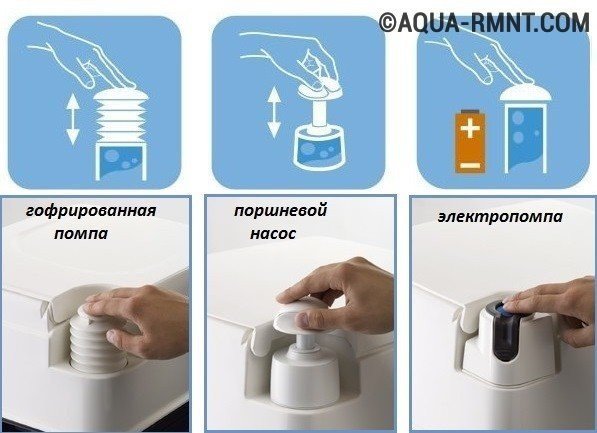 type de pompe Non fourni - pompe accordéon (pour les modèles moins chers); - pompe à pistons ; - pompe électrique (pour les modèles les plus chers)