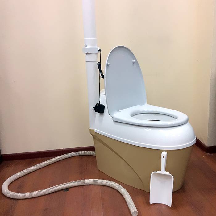 Extérieurement, l'appareil ressemble à des toilettes familières, mais il n'y a pas de tuyau pour évacuer les déchets dans les égouts. Le traitement des déchets sous l'influence de divers catalyseurs a lieu dans la chambre de stockage.