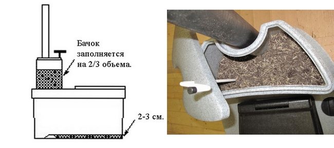 Avant de commencer à utiliser l'appareil, vous devez soigneusement laver le récipient et y verser une petite couche de tourbe (environ un centimètre).En faisant défiler la poignée du distributeur, vous devez verser la bonne quantité de composition. Au cours de cette action, il est nécessaire de faire tourner le distributeur dans différentes directions afin d'obtenir la couche de tourbe la plus uniforme.