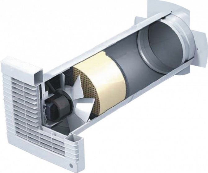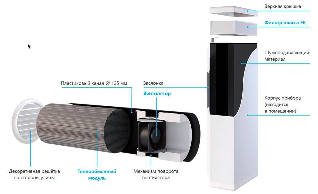 Un ventilateur supplémentaire est intégré dans la fenêtre à double vitrage, formant un espace étroit à travers lequel l'air s'infiltre en continu dans la pièce dans le volume requis et stabilise l'échange d'air. Sa conception se compose souvent des éléments principaux :