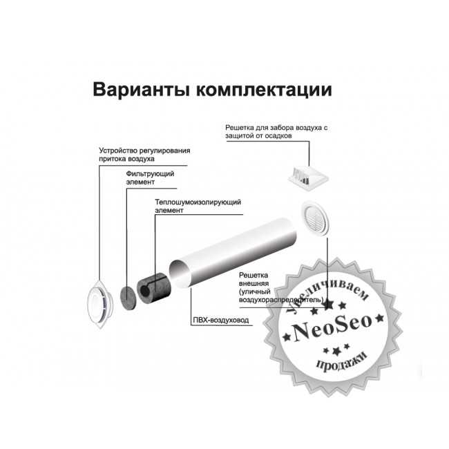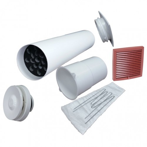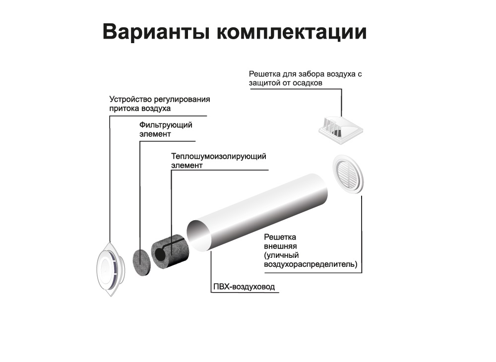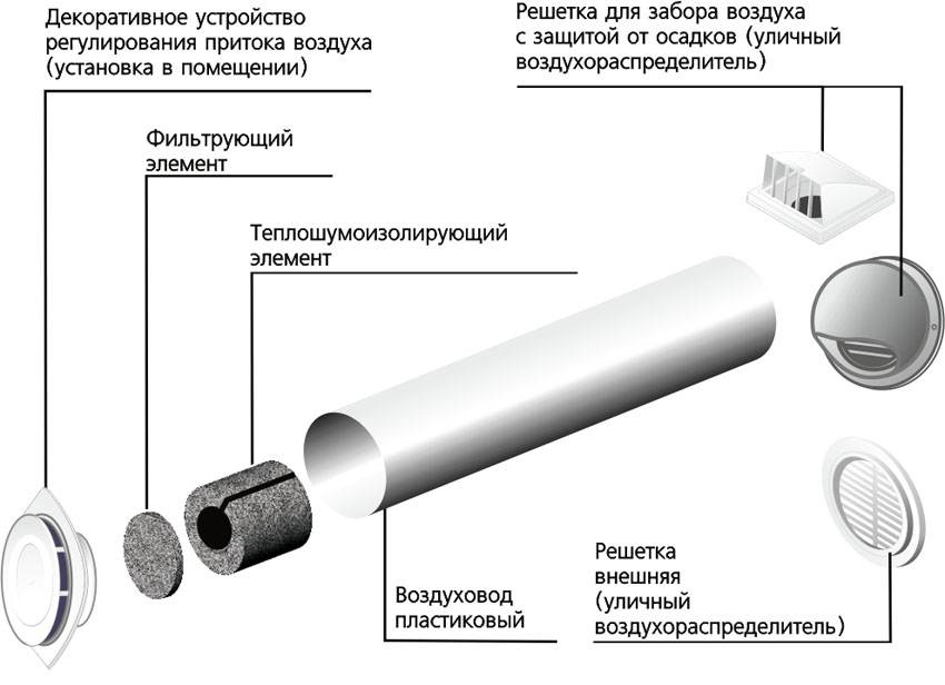 - Soupape d'admission d'air. Cela ressemble à un tube en plastique d'un diamètre de 6 à 14 cm.Les performances de la vanne dépendent de ce paramètre, la quantité maximale d'air pouvant être fournie à l'appartement avec son aide. L'air de l'extérieur pénètre dans la pièce par le tube.