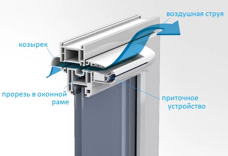Une vanne de ventilation d'alimentation supplémentaire peut être fournie avec la fenêtre ou installée séparément. Le principe de son fonctionnement est que l'air frais de la rue est aspiré dans la pièce et que les masses chaudes et le dioxyde de carbone sont évacués par les conduits de ventilation sous l'influence d'une différence de pression. Une telle circulation des flux est considérée comme passive.