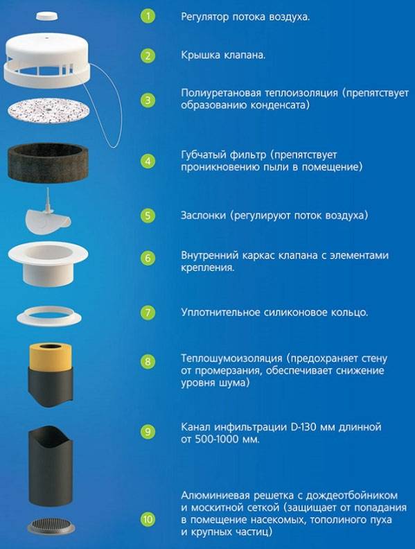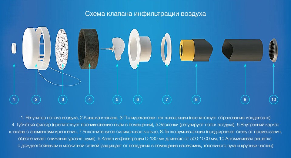 - La capacité des vannes de ventilation installées dans le mur dépasse les performances des "fournitures" de fenêtre et peut atteindre 60 à 70 mètres cubes par heure.