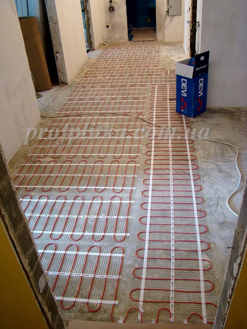 Pose dans un coupleur. Non seulement une barrière hydroélectrique est placée sur le sous-plancher, mais également une isolation thermique. Sinon, vous serez parrain du beau temps des voisins d'en bas. Ensuite, la grille de montage (lorsque vous travaillez avec un câble linéaire), sur laquelle le "serpent" de chauffage est posé. Des feuilles infrarouges ou des tapis chauffants sont montés de la même manière.Une chape d'une épaisseur d'au moins 30 mm est coulée sur le dessus.