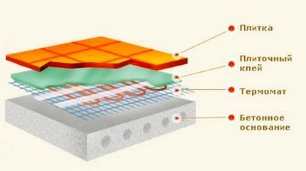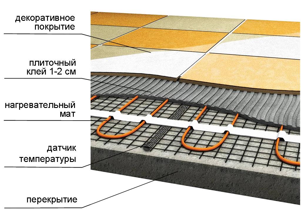Ceux qui disent que le béton ne se réchauffera pas autant ont raison. En raison des caractéristiques de conception et des lois de la physique, les tapis chauffants dans une couche de colle à carrelage chaufferont à la fois le béton par le bas et le carrelage par le haut. Et si le câble dans la chape doit d'abord réchauffer la chape elle-même et que la chape chauffe déjà le sol (carrelage et autres), les tapis n'ont besoin de chauffer que le carrelage + la colle. Il convient de noter que le capteur de température du sol est installé dans le carreau et que le degré de chauffage est régulé par le carreau. Et comme le carrelage chauffe bien plus vite que la chape sous les nattes, et encore plus la dalle béton, ça ne fonctionnera pas pour chauffer les voisins par en dessous.